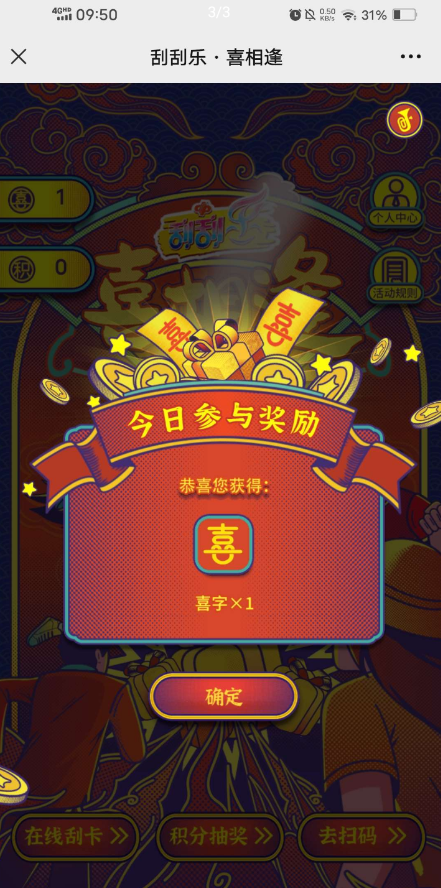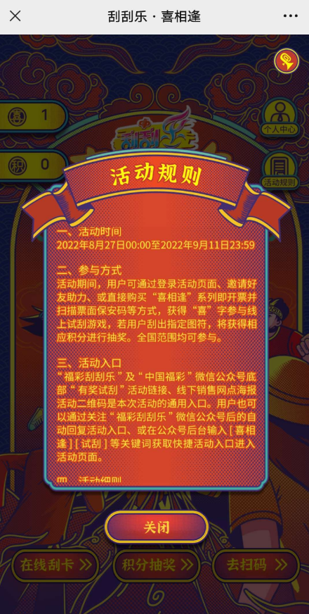 【活动规则】福彩刮刮乐喜相逢抽腾讯视频VIP月卡等,每天进入活动都会获得1个喜字,好友助力也可以获得1个,有喜字以后点【在线刮卡】抽积分,积分抽奖即可。