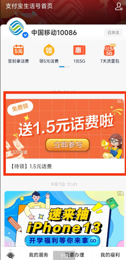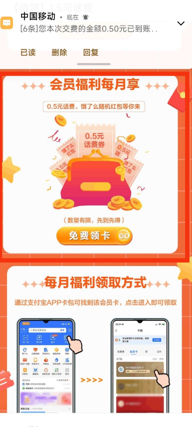 【参与方式】支付宝搜中国移动10086,然后找到生活号点进去,第一条推文进去,免费领卡