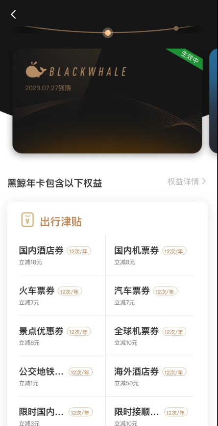 【活动介绍】黑鲸年卡权益,拥有同程旅行黑鲸卡部分权益,也显示黑鲸年卡图标,平常定下酒店,机票等有优惠券能不少钱,一句话,我可以不用,但是我不能没有