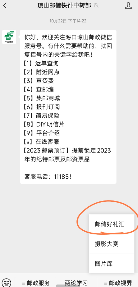 参与方式:关注公众号【琼山邮储快件中转部】,底部菜单邮政视界弹出的邮储好礼汇,看图1