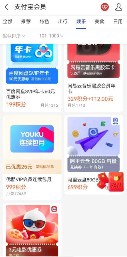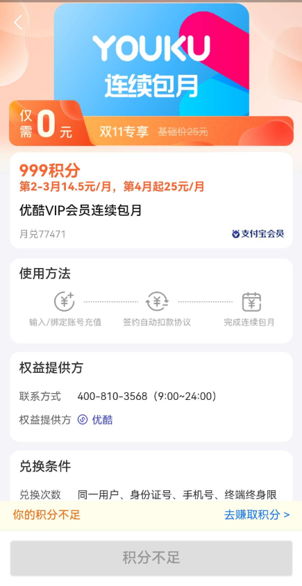 【参与方式】支付宝APP->我的->支付宝会员->选择“娱乐”->积分筛选“100~1000”->0元开优酷会员月卡->最后去支付设置里取消自动续费即可