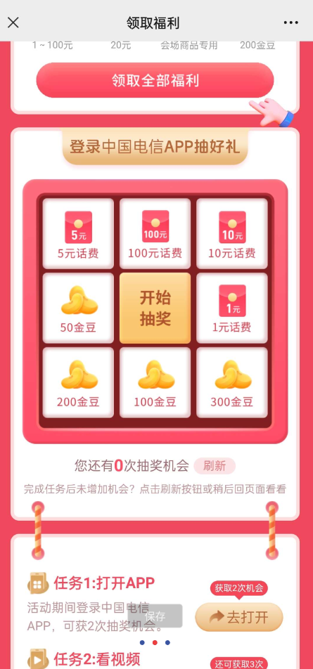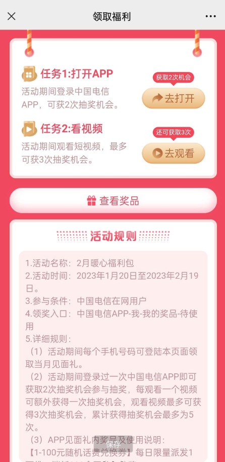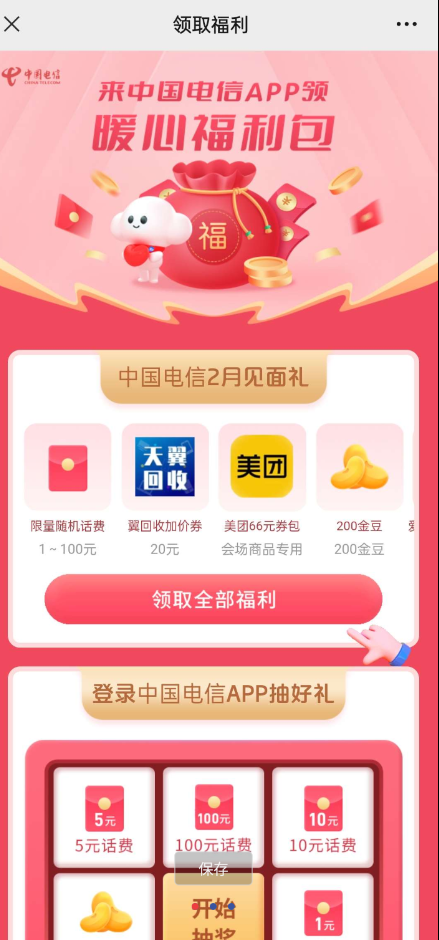 首页 > 活动线报 > 电信暖心福利包抽1~100元话费