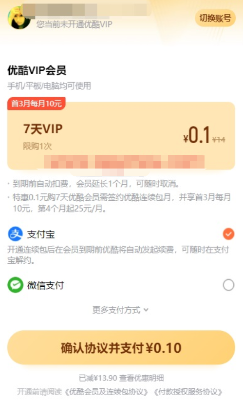 0.1元开通7天优酷VIP会员,开通后记得点去取消连续包月。