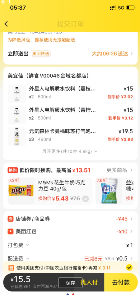 (淘宝右上角签到→领红包→搜美团→购买美美团通用红包),返回美团下单
