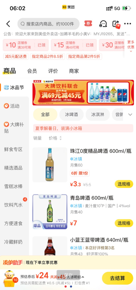 【参与方式】美团app→首页→外卖→美宜家→领劵【69-30】元气森林系列【59-15】