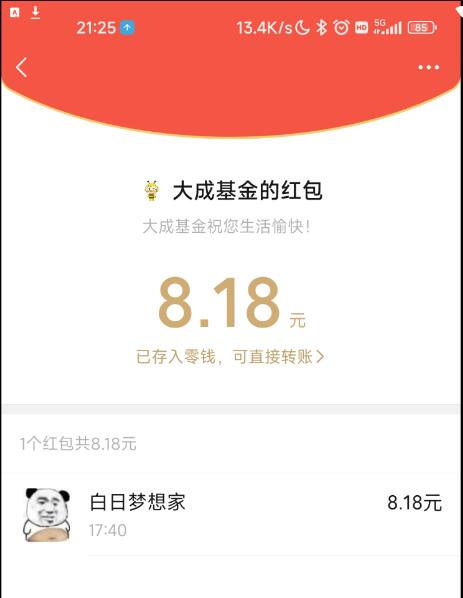 【其他说明】抽到红包需要关注微信公众号【大成基金】并回复【818理财节】点推送进去领取红包就会推送
