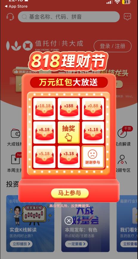 【参与方式】打开大成基金APP登录后,点击弹窗进去活动里,或者点击左上角头像,再点【活动中心】进去第一个活动进去活动里直接抽奖,每个账号有1次抽奖机会