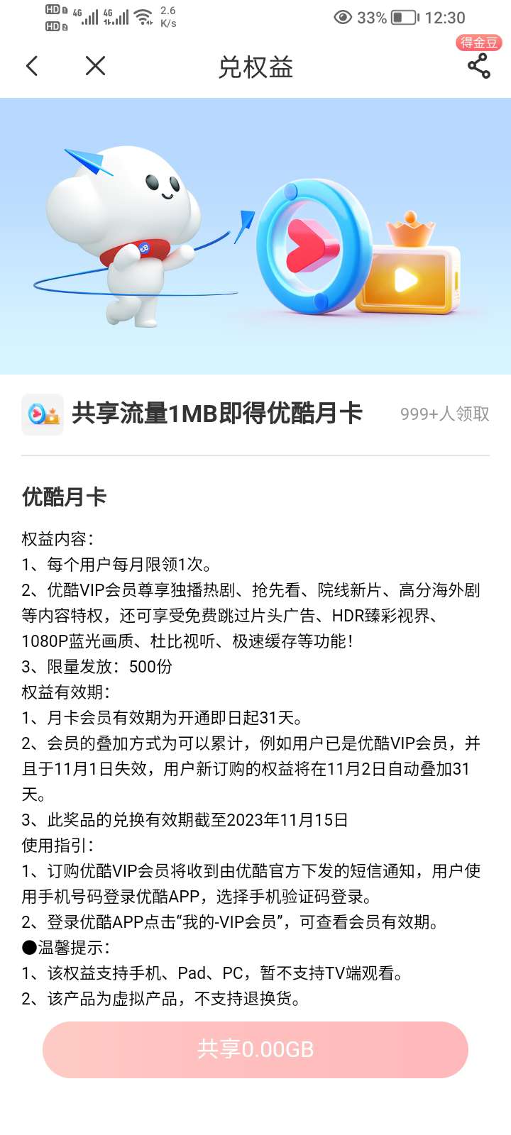4、然后就会到账1个月优酷VIP会员,优酷会员直接到账你参加活动的手机号码上,是直冲会员秒到的