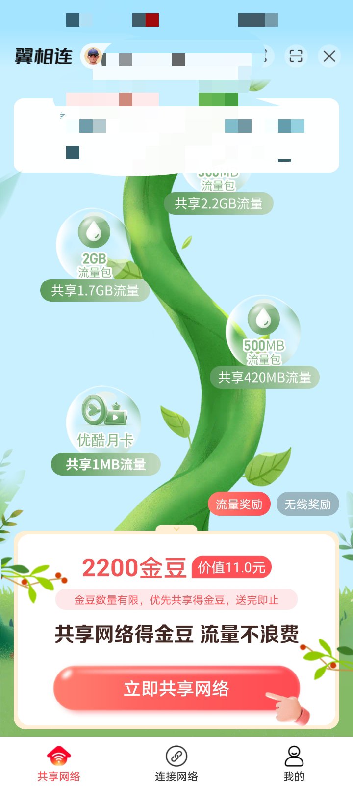 2、打开中国电信APP,搜索【流量共享】进去活动里点立即共享网络参加