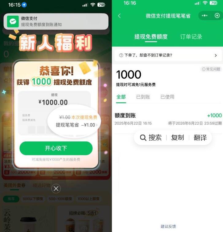 微信领取1000免费提现额度