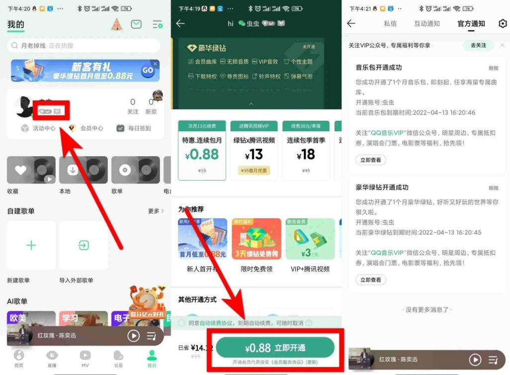 部分人0.88元开豪华绿钻30天 限安卓手机用户参与! 扣扣音乐APP->我的->点击头像旁边的“绿钻图标”->右滑到“豪华绿钻”界面 看金额显示0.88元开通即可参加->扣扣微信都可开通开通后去取消自动续费 PS:微信APP->右下角“我”->支付右上角->扣费服务进去关闭!