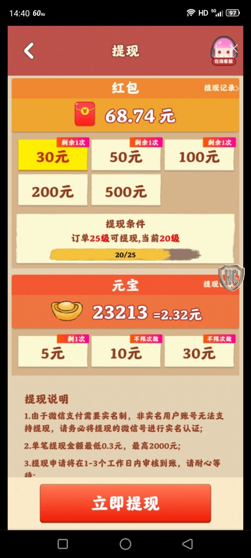 微信扫码实名认证才可以提现哦!