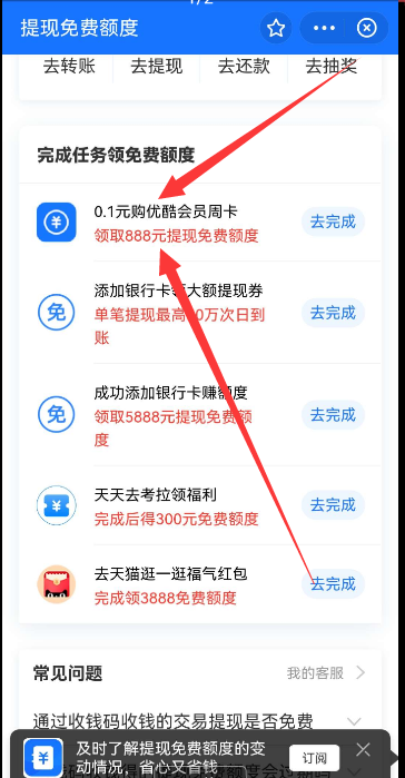 【参与方式】打开支付宝APP--余额--免费额度,看到“0.1元购优酷会员周卡”