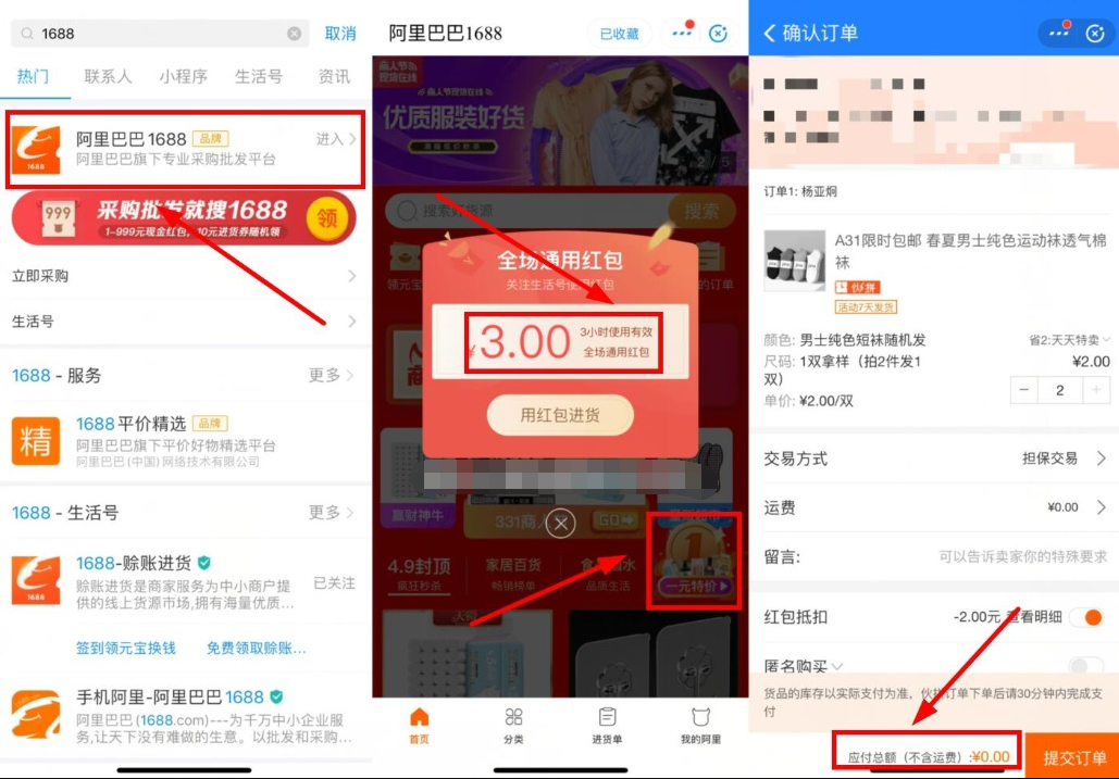 0元撸小额实物 阿里巴巴1688领无门槛红包