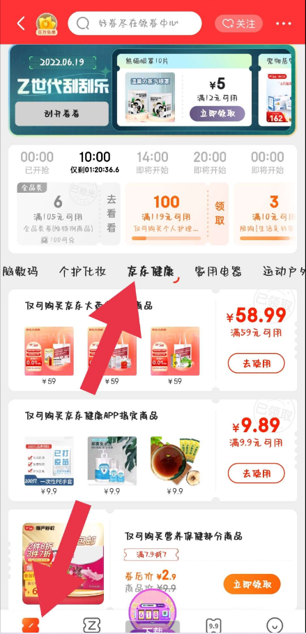 【参与方式】1、京东APP->首页“领券”进入->京东健康->领取9.9减8.89元券