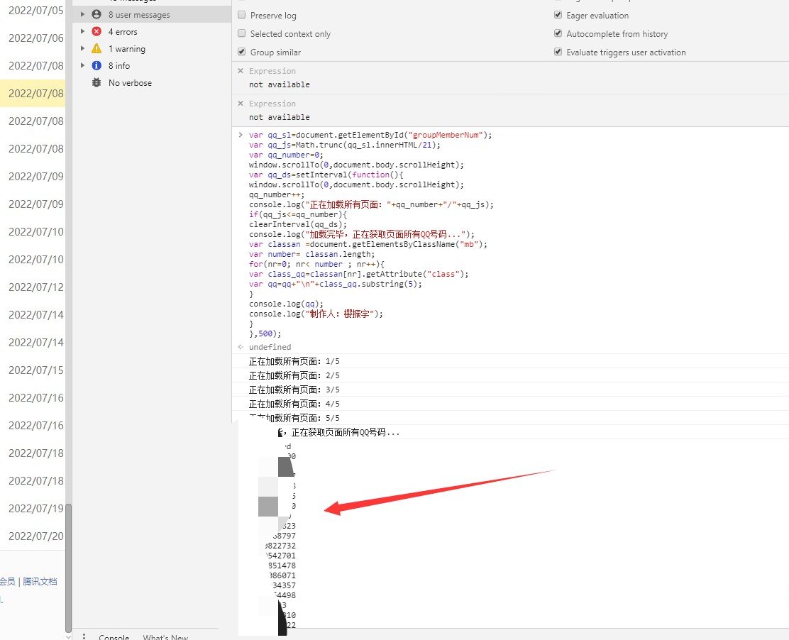 4.然后把代码粘贴在上面之后,按下回车建,它就会自动给你获取这个群里的所有扣扣号了。