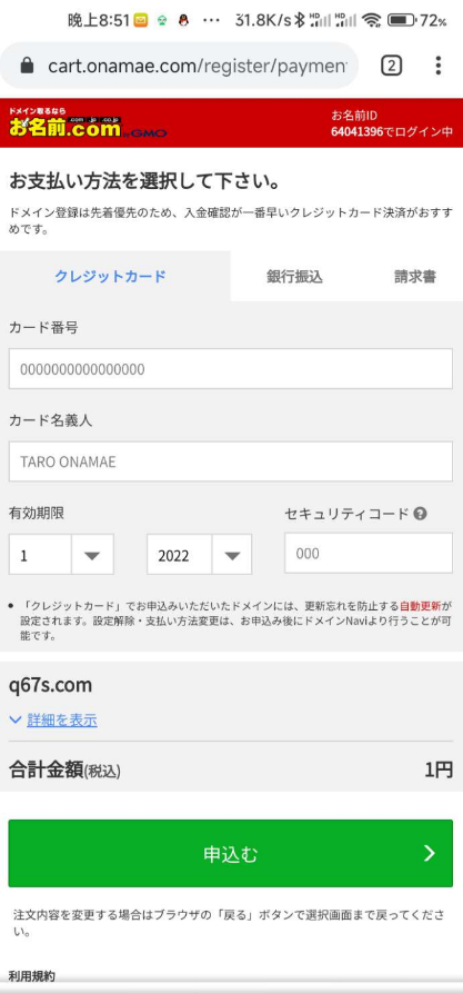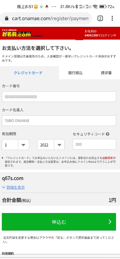 返回onamae的主页面,点击右上角的登录,把刚刚复制的id输入进去[滑稽],密码还是之前设置的[滑稽],登录会给你发个邮件验证,登录进去后会让你填写信息,这时候我们不用管,直接点右下角域名下面绿色的按钮,然后还是会填写信息[玫瑰][滑稽],自己去网站里面复制粘贴,填写完后点确认,还是到最后一步付款我们去https://navi.onamae.com/sp/top这里点击 一起工作 这样才能利用1日元,要电脑版网站才有这个选项改一下浏览器标识[滑稽]然后再点右下角的域名进行付款