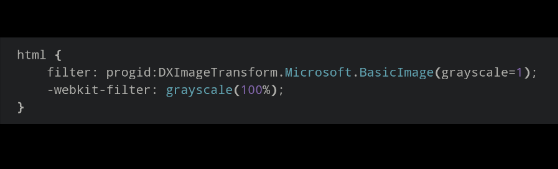 快进来 将网站变成黑白,只需要在CSS代码中加上: html { filter: progid:DXImageTransform.Microsoft.BasicImage(grayscale=1); -webkit-filter: grayscale(100%); } 这一段就行了