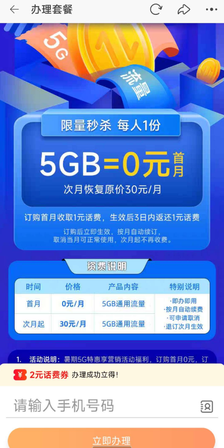 3.下面会显示一个0元领5G办理即可