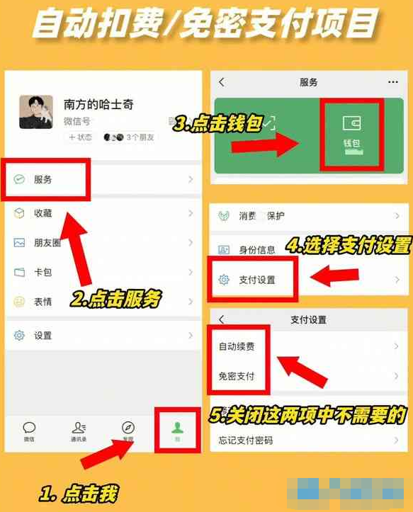 微信里面的个人隐私信息必须要注意,尤其是微信里面设置里面的一些功能,都应该要及时关闭,以免自己就的个人隐私遭到暴露。 1,自动扣费/免密支付项目 点击我→服务→点击钱包→选择支付设置→关闭自动续费、 免密支付,这两项不需要的。
