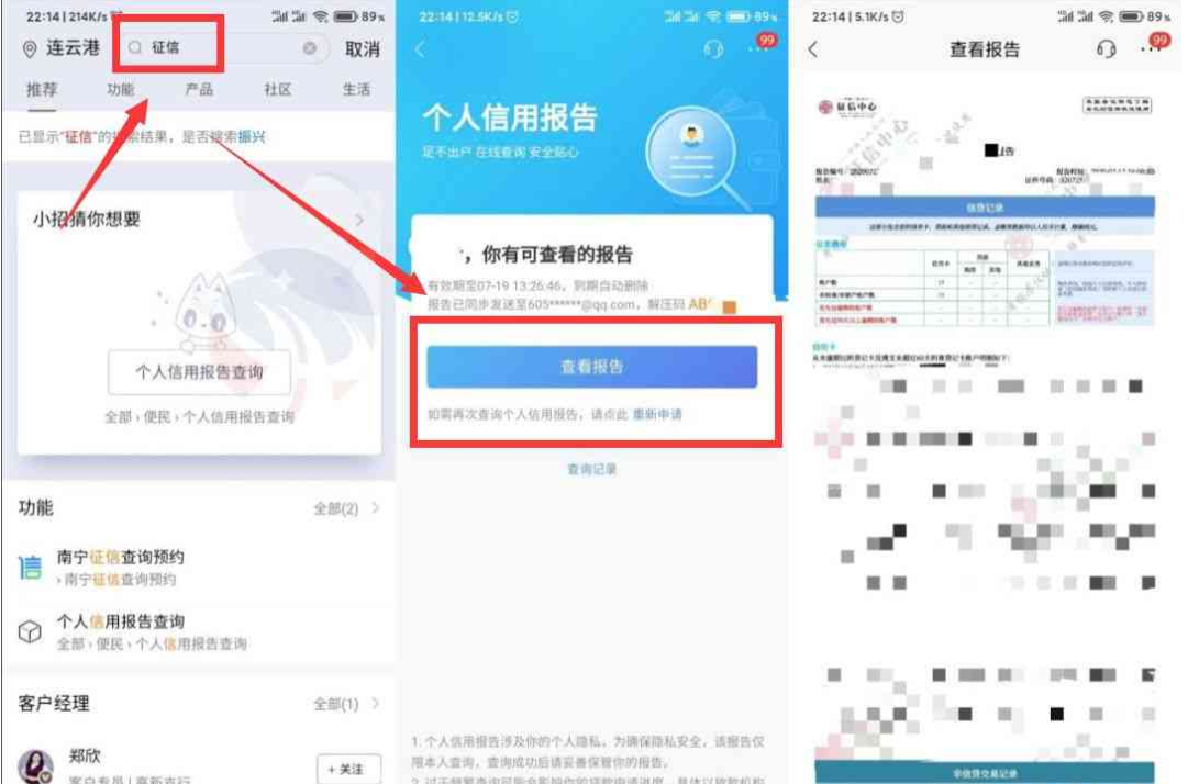 步骤如下: 1、打开招商银行APP(任何人都可以注册哈) 2、首页搜索:征信 点击个人信用报告查询, 验证信息后24小时内会给你报告。 可以去查查自己的信用是否有问题,有无逾期问题。 成功后会给你消息通知的,在消息代办里面即可看到报告, 查询的信息还是比较准确的,征信没问题的话 以后就可以贷款买车买房了,有问题就不行哦!建议都去查一下!