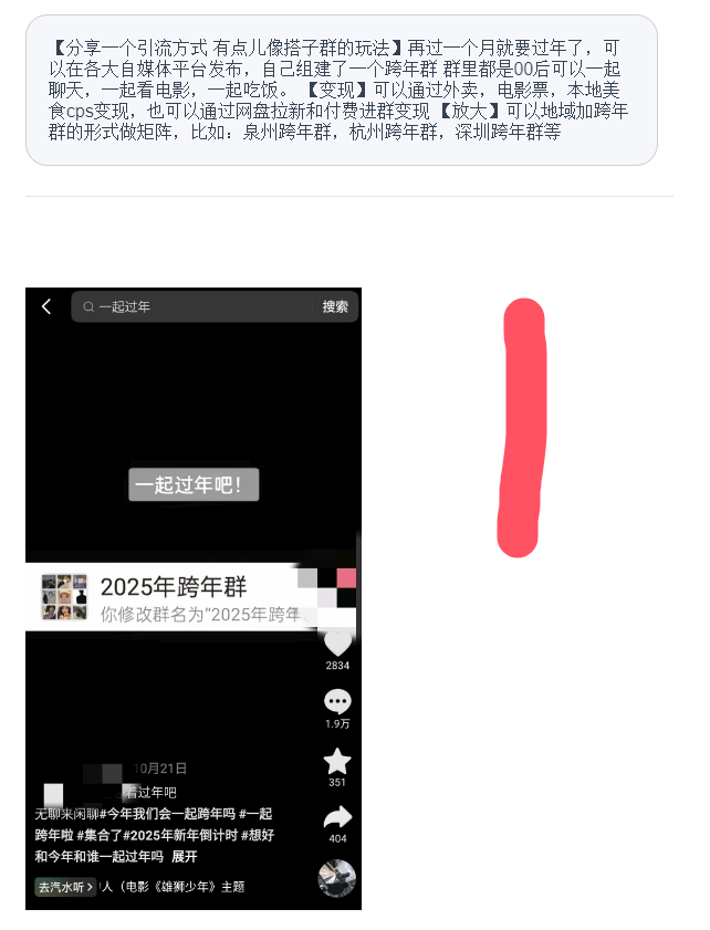 【分享一个引流方式 有点儿像搭子群的玩法】再过一个月就要过年了,可以在各大自媒体平台发布,自己组建了一个跨年群 群里都是00后可以一起聊天,一起看电影,一起吃饭。 【变现】可以通过外卖,电影票,本地美食cps变现,也可以通过网盘拉新和付费进群变现 【放大】可以地域加跨年群的形式做矩阵,比如:泉州跨年群,杭州跨年群,深圳跨年群等