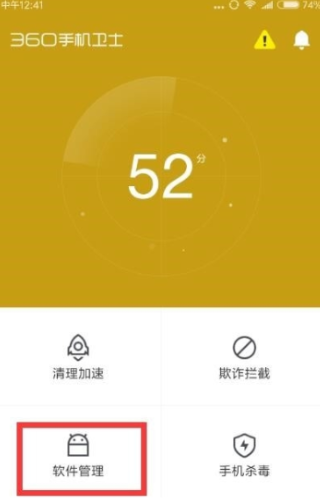 2.手机获取root权限后,可以通过第三方工具来卸载手机自带软件,小编以360手机卫士为例,安装360之后在软件主界面找到“软件管理”按钮打开,进入下一步。