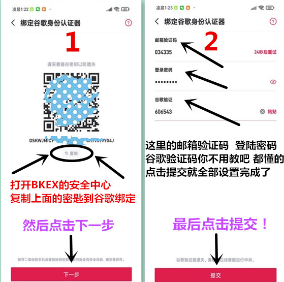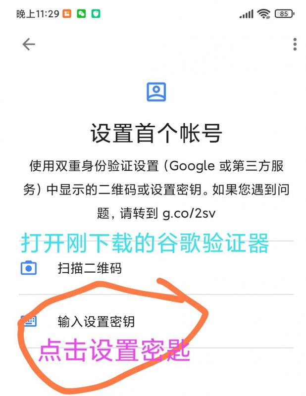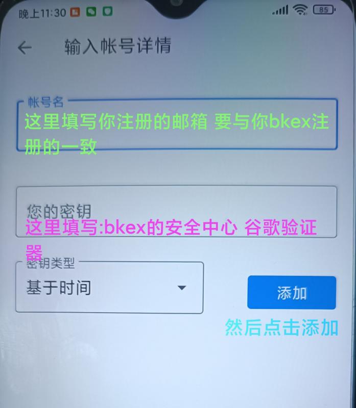 先打开谷歌验证器 点击设置密匙 再填写账户名 和你的密匙 如下图: