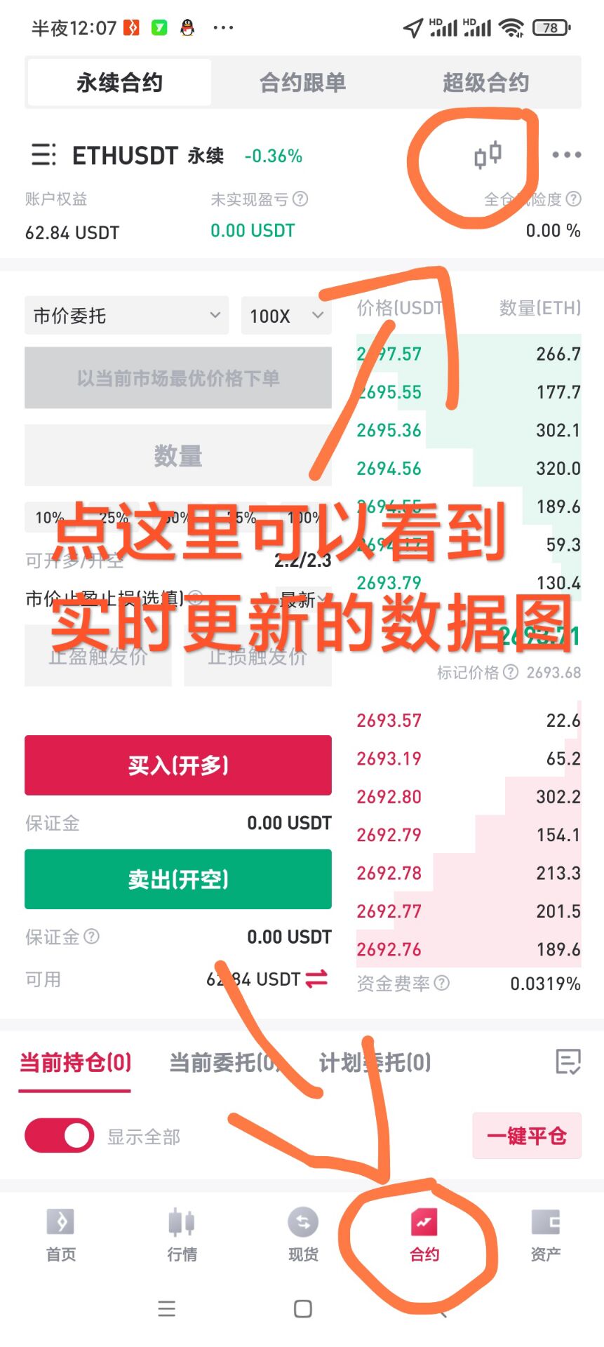 第五步:点击最下方的合约 可以选择买涨就是(买入开多)或者买跌(卖出开空) 只要你猜对跌涨就赚钱了!