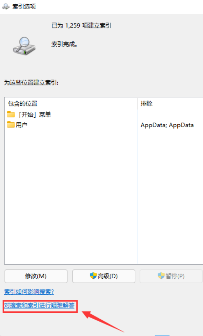 4、索引选项窗口,点击底部的【对搜索和索引进行疑难解答】;