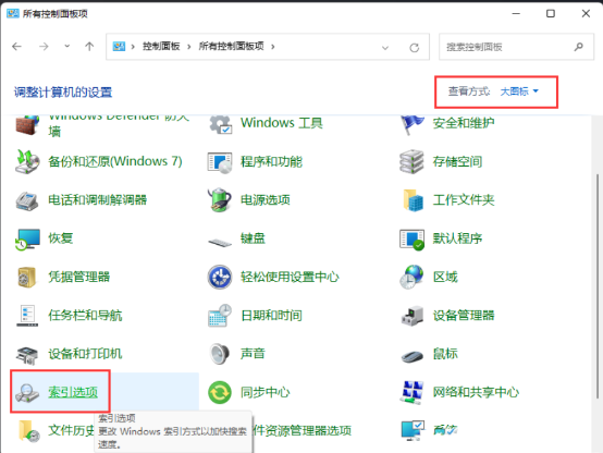 3、所有控制面板项窗口,将查看方式调整为【大图标】,然后找到并点击调整计算机的设置下的【索引选项】;