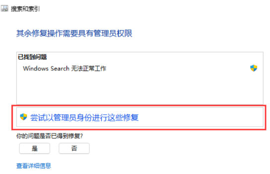 7、其余修复操作需要具有管理员权限。已找到问题,Windows Search 无法正常工作,点击【尝试以管理员身份进行这些修复】。