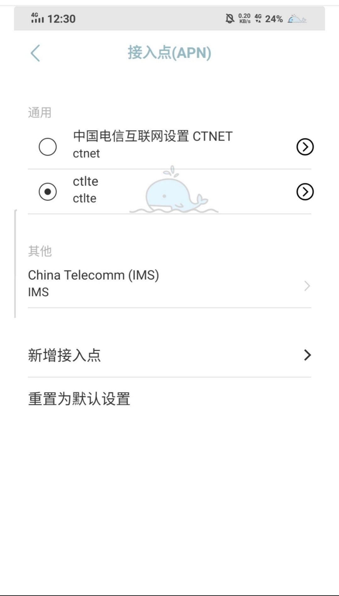 首先进入apn添加一个新的apn,然后把名称和apn都设置成ctlte,用户名设置成:ctnet@mycdma.cn