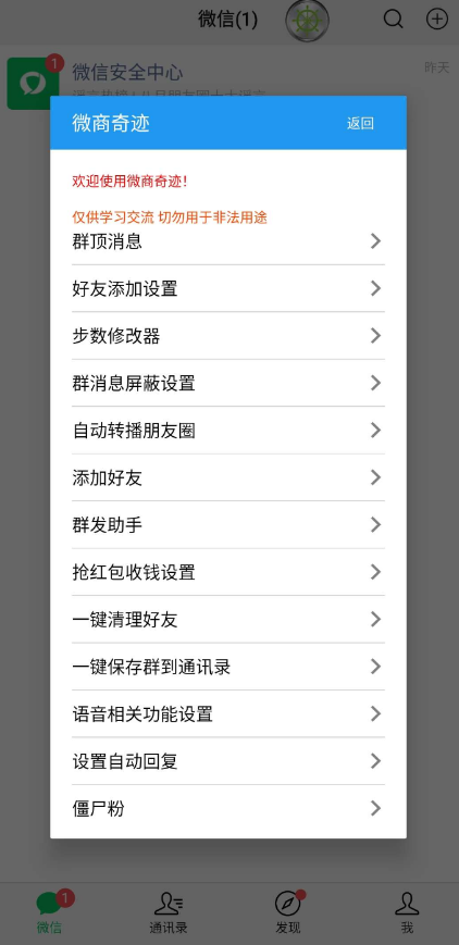 微商奇迹是一款微信多功能辅助应用,主要功能: 消息自动防撤,自动抢包,语音转发,消息自动回复,批量群发,批量清理好友,僵尸粉检测,讲课助手,朋友圈转发等等,此应用以框架内置WX启动,无需卸载官方,安装可与官方共存使用。内置的微信为官方微信,无任何修改,理论百分之九十九防封。楼楼已为各位伙伴去除授权验证,版本更新。