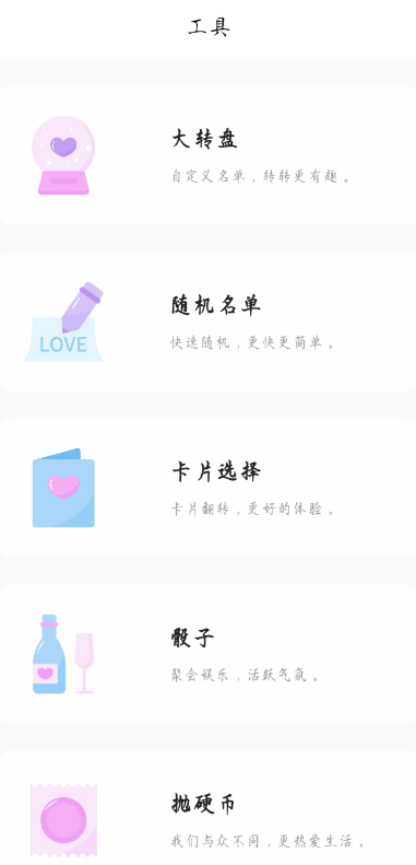 3、多种小工具:骰子、大转盘、抛硬币、随机名单、卡片选择。