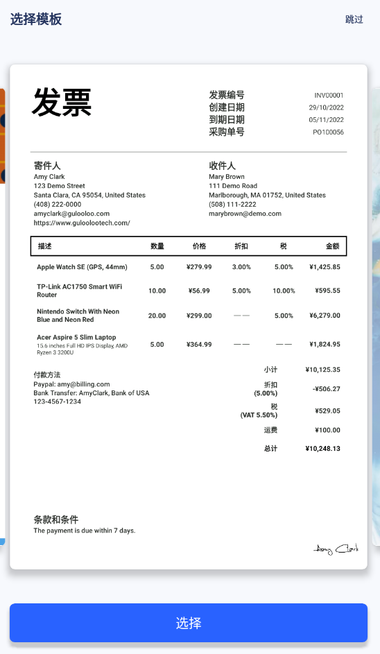 支持自定义客户,税收,折扣,条件和条款,附件等。
