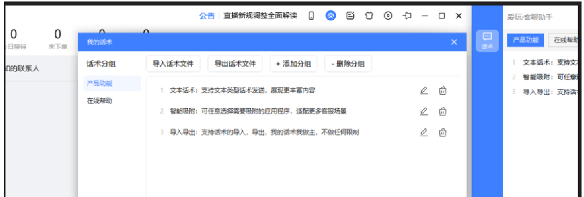 话术管理,支持导出,导入话术文件,添加分组、删除分组