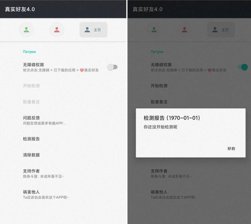 真实好友 4.0 微信好友检测【应用名称】真实好友 【应用版本】4.0 【应用大小】2.0MB 【适用平台】安卓 【应用介绍】真实好友是一款十分便捷实用的微信手机好友检测工具,在这里你能看到朋友的拉黑状况,可以通过软件来检测你的微信好友目录,非常简单的操作工具哦!无需任何辅助,也无需root,一键开启,安全稳定,你可以来下载试试哦!