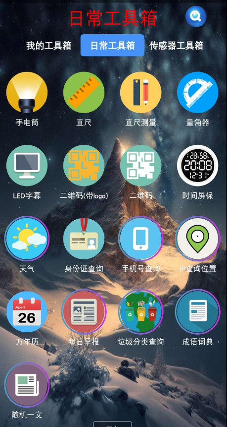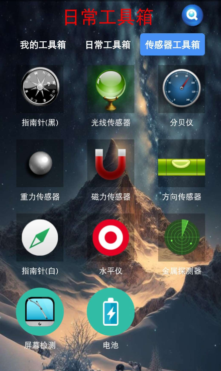 【软件介绍】:指南针, 光线传感器,分贝仪,重力传感器,磁力传感器,方向传感器,水平仪,金属探测器,手电筒,直尺,电池,量角器,LED字幕,二维码,时间屏保,日期计算器,天气,屏幕检测,身份证查询等等。
