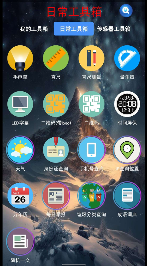【软件介绍】:指南针, 光线传感器,分贝仪,重力传感器,磁力传感器,方向传感器,水平仪,金属探测器,手电筒,直尺,电池,量角器,LED字幕,二维码,时间屏保,日期计算器,天气,屏幕检测,身份证查询等等。