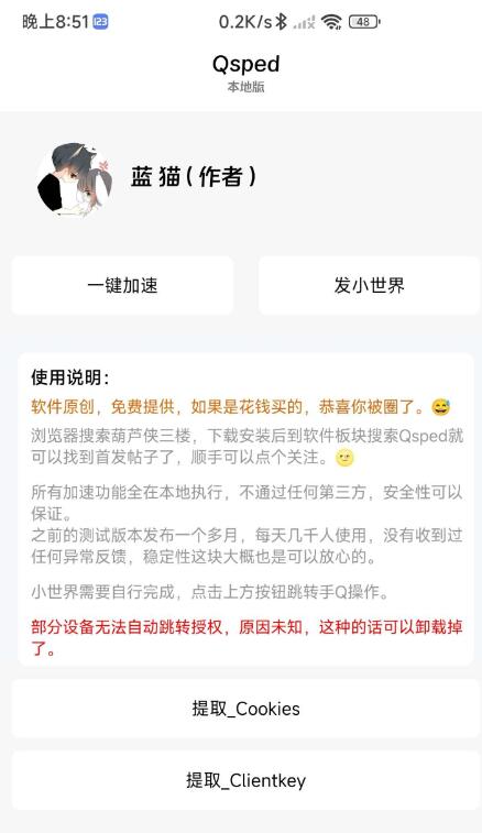 可以看成是『Qsped v1.005』的一个提取版本,避免服务端问题影响正常使用(被攻击,网络波动,服务器到期……),去除了验证码机制(也是防攻击的,本地版用不上了)。