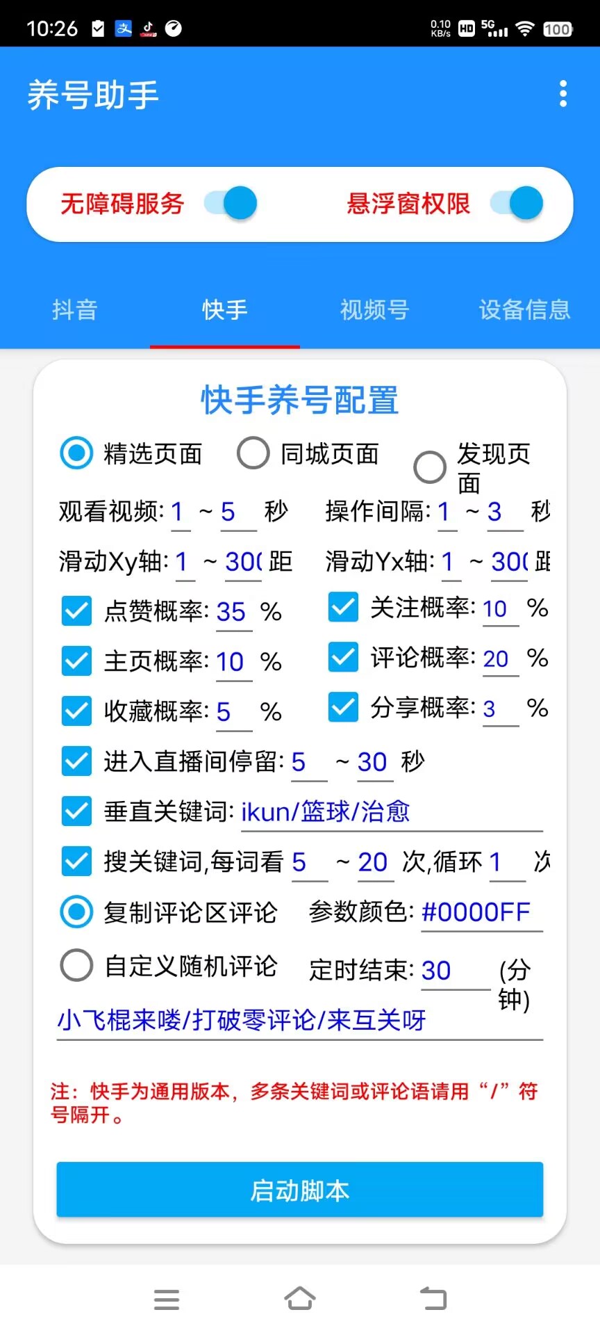 养号助手1.0抖音,快手,视频号三平台自动观看视频,浏览主页,点赞关注,评论收藏, 随机直播间浏览