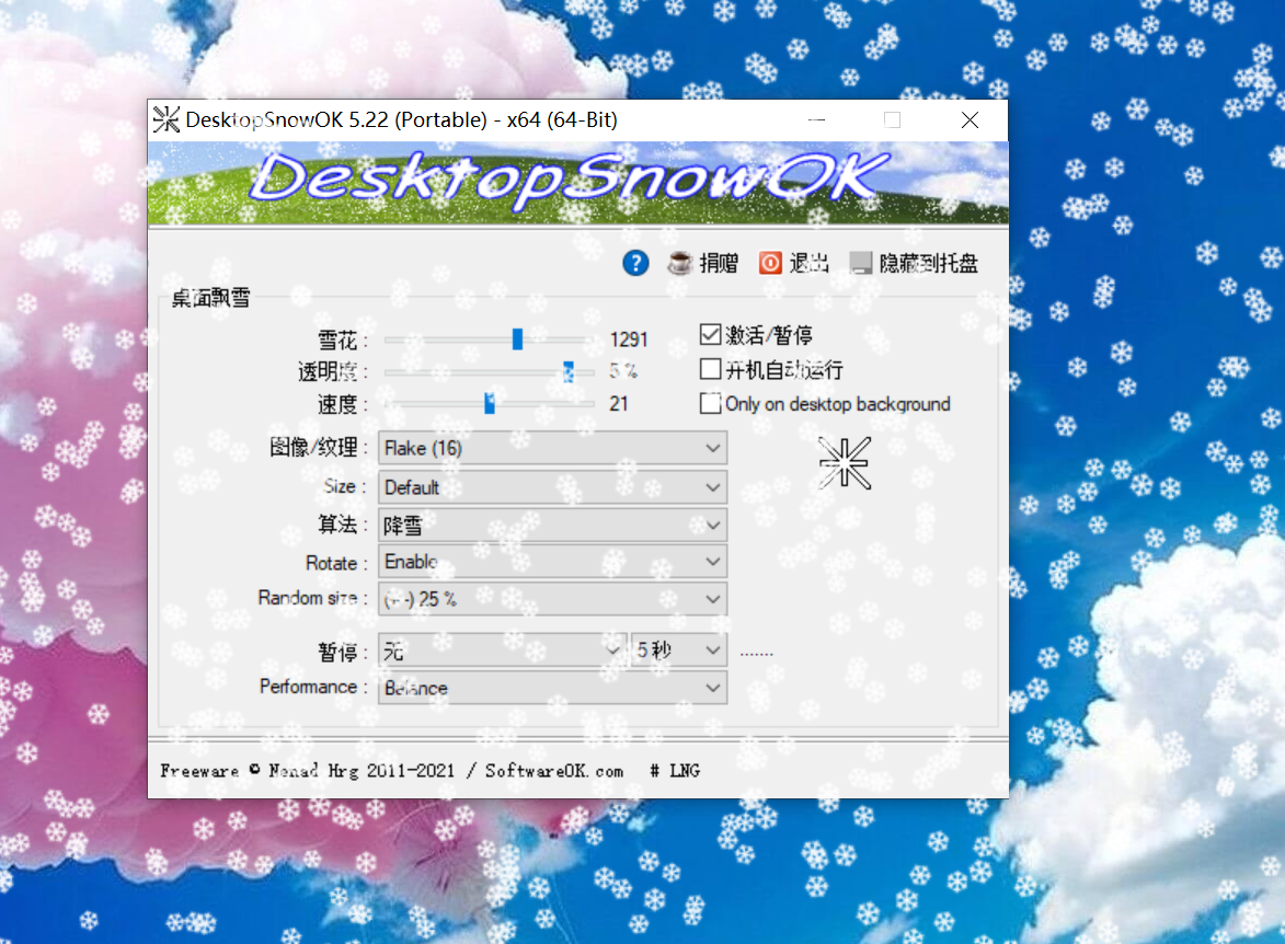 相信兄弟们都放暑假了吧,夏日炎炎的,边吹空调看看雪花啊 这不,我就为你们带来你们喜欢的雪花了~~~It is DesktopSnowOK!!! 当然,它虽然只有几百K,但是可以下的不单单是雪啊!!你可以选择自己喜欢的形状图案 它支持下雪、下树叶、下各种秋、下爱心、下各种花、下星星、各种混合啥啥啥的 支持控制下落速度、透明度、大小、方向啥的可以用这个小工具点缀一下桌面,愉悦一下心情~~~
