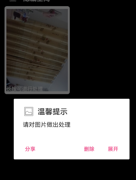 3.计算器输入666666后长按=可以前往隐私空间,长按图片可以进行 分享 删除 展开(注:使用本APP拍摄的犯罪证据不会出现在相册)