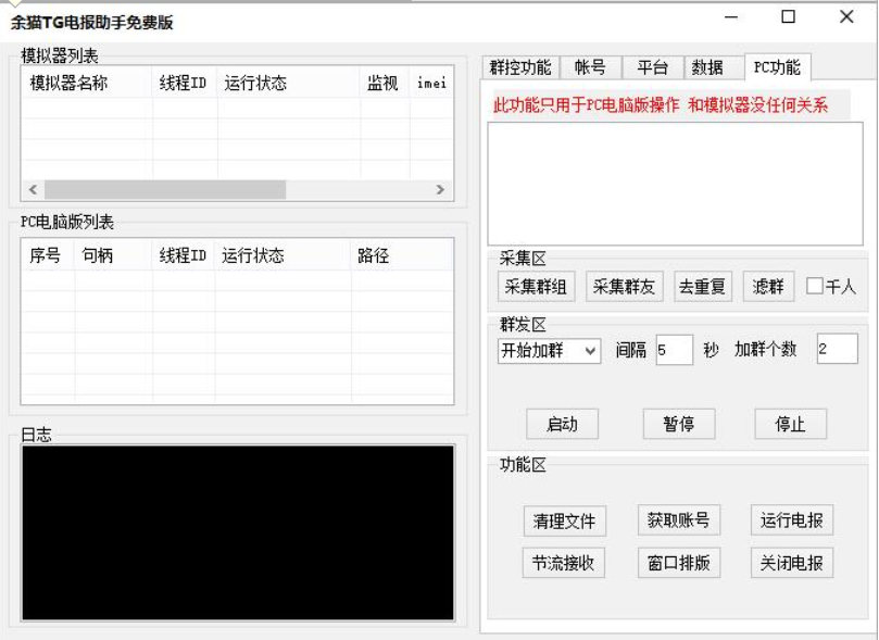 功能介绍 支持双端口:支持PC端和模拟器双端口 全自动操作:24小时循环发消息,引爆流量 自动注册:自动注册飞机账号 自动采集:自动采集群组和群成员 自动加群:自动加入群组 自动群发:自动群发消息,自动私信,24H循环操作 自动拉人:自动拉人进群
