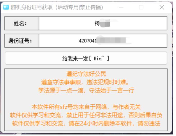 随机身份证号获取器 游戏实名,活动必备,禁止非法用途