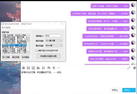 【软件介绍】本软件就是模拟快捷键来实现的模拟按键批量发送消息,开启模拟器后鼠标选中要模拟发信的聊天框软件就会按照你设定时间和词库进行模拟发信,比如用于模拟QQ或者微信等这些简单发信的软件,右键词库列表框,是可以单独添加自定义的一些词库!本软件若是在其它发信软件不能用,可能是因为别的发信软件加了安全(软件程序做了手脚,监控了API调用,阻止模拟键盘的程序),所以没办法进行模拟按键发信!