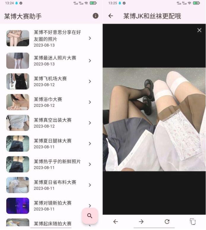 软件名称:某博大赛助手 软件大小:15mb 适应平台:Android 软件介绍: 本软件采集某博的各种奇葩养眼大赛,欢迎各位下载收藏 软件数据每天都会更新,支持搜索。