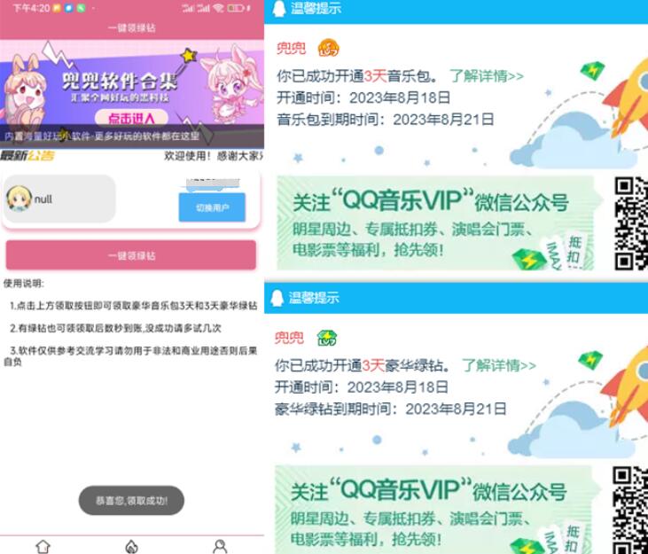 一键秒领绿钻v2.0一键领取3天QQ豪华绿钻和音乐包