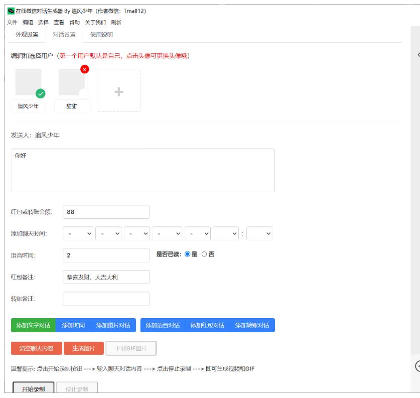微信对话生成器。作为一款聊天记录制作工具,它能够模拟微信聊天,让我们可以轻松制作逼真的聊天对话。微信对话生成器具有许多强大的功能。首先,它支持添加不同的用户角色进行对话。我们可以自由设定对话的参与者,并为每个角色添加自定义的头像和昵称,使对话更加真实。其次,微信对话生成器支持发送多种类型的内容,包括文字、语音、图片、红包、转账等。我们可以根据需要添加不同类型的消息,使对话内容更加生动有趣。